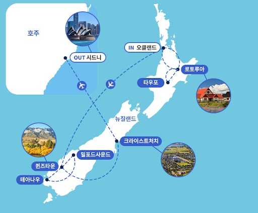 * 현지 사정에 따라 메뉴는 변경 될 수 있습니다■ 관광지 1. 뉴질랜드 북섬 - ♥오직 한진관광 에서만!! 가능한 TOUR♥ 타우포 송어 낚시: 세계적인 송어 낚시터에서 송어 낚시 체험하기 호수의 절벽 절경 감상은 덤! - 아그로돔 팜투어: 농장에서 귀여운 양, 알파카 동물에게 먹이주기 체험 - 로토루아 와카레와레와: 신비로운 지열지대에서 염화 온천 관람 - 폴리네시안 온천욕: 로토루아의 세계적인 온천에서 여행의 노곤함을 풀기 - 레드우드 트리워크: 레드우드 숲 산책로 탐방, 지상 12미터 높이의 출렁다리를 거닐며 멋진 전망 감상 - 파라다이스 밸리: 아프리카 사자, 뉴질랜드 송어. 다양한 야생동물 만나기 - 에덴동산: 분화구에 올라 오클랜드 시내 전경 감상 - 오클랜드: 마이클세비지 공원, 미션베이 등 2. 뉴질랜드 남섬 - 여왕의 도시 퀸즈타운: 에로우타운, 와카티푸호수, 번지점프대 관람 - 인생에 한번쯤은 꼭 가야하는 밀포드사운드: 유람선 탑승하여 펼쳐지는 피요르드 장관 관람 - 마운트쿡 국립공원, 푸카키호수, 데카포 호수 : 켄터베리 대평원을 경유하며 느끼는 대자연의 감동 - 남섬의 필수 관문 코스 크라이스트 처치 에이번강, 헤글리 공원: 뉴질랜드 속의 작은 영국, 정원의 도시에서 느끼는 여유로움 느끼기