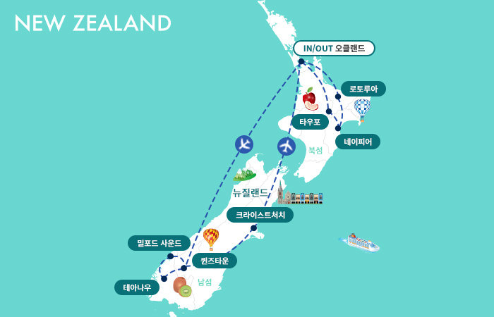 =호텔조식 =가이드 미팅 후 밀포드사운드로 이동 호머터널을 경유하여 이동 아름다운 풍경이 거울처럼 수면에 비치는 거울호수 =밀포드 사운드 피요르드 해안 관광 밀포드 유람선 탑승 https://www.kaltour.com/photogal/Large/ZQN202.jpg 약 1만2천년전 빙하에 의해 형성된 피요르드 해안의 절경 감상 https://livehtsweb.kaltour.com/fileupload/photogal/Large/ZQN391.jpg 만년설이 녹아 만들어진 폭포수를 직접 맞을 수 있는 스털링 폭포, 마이터피크, 라이언마운틴 등 https://livehtsweb.kaltour.com/fileupload/photogal/Large/ZQN524.jpg (현지 기상 악화 시 언슬로 증기선 일정으로 대체될 수 있습니다.) =퀸즈타운으로 귀환 =석식 =호텔 투숙 및 휴식 호텔 상황에 따라 숙박지역이 변경될 수 있습니다. (크롬웰, 와나카, 인버카길 등) | ||