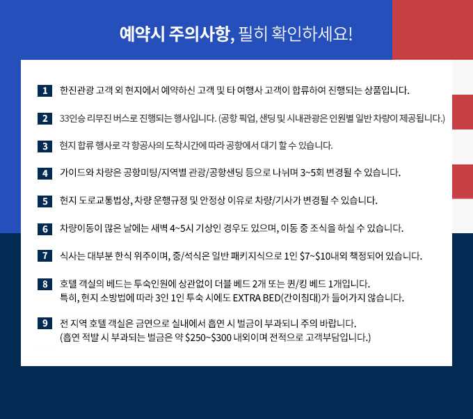 ※ 상기 일정은 계약 체결 시 예상하지 못한 부득이한 사정이 발생할 경우 여행자의 사전 동의절차를 거쳐 변경될 수 있습니다. 주의 : 여행요금 입금은 한진관광 본사 계좌(예금주: ㈜한진관광)로만 입금을 받고 있습니다. 개인 계좌로 입금은 일체 없으며, 여행사 직원을 사칭한 보이스피싱 등 피해가 발생할 수 있습니다. 자세한 예약 확인 및 입금 조회는 홈페이지를 통하여 확인하실 수 있습니다. |