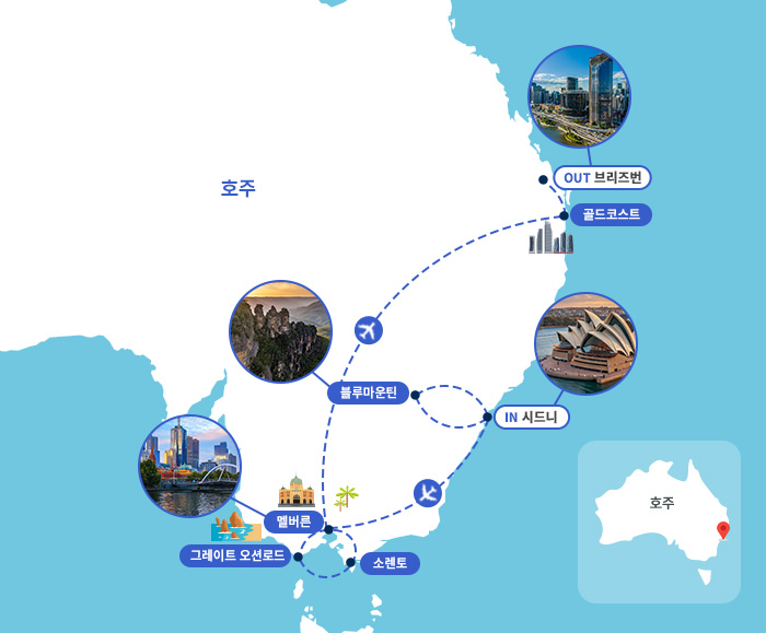 ■ 항공 - 대한항공 시드니/브리즈번 직항편 이용- 호주 내 국내선 2회 이동으로 차량 이동 최소화로 편안함 UP * 콴타스 젯스타 버진아일랜드 등 항공사 이용