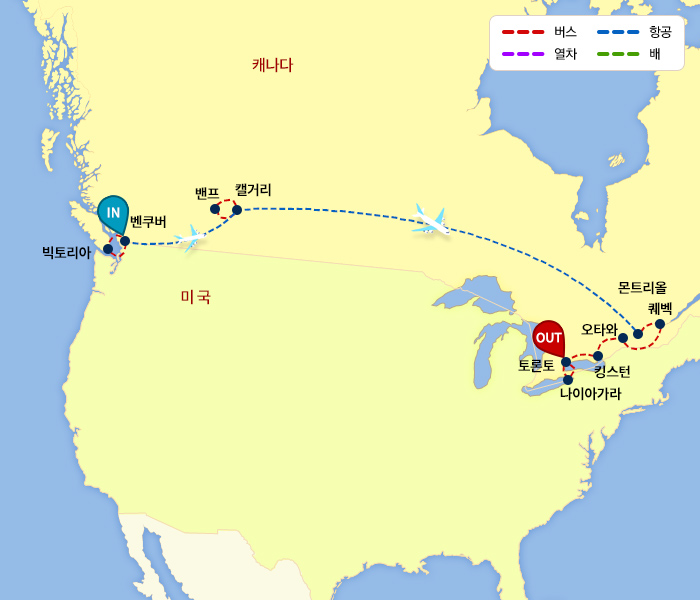 밴쿠버-캘거리-몬트리올 구간 현지 국내선(AC 또는 WS) 탑승 ※ 캐나다 국내선 구간 위탁수하물은 1PC만 포함하고 있습니다. 무게 초과, 개수 초과 시 추가 요금이 발생됩니다. (현지 지불) ※ 현지 국내선 구간은 사전 좌석 배정이 불가합니다. 【 차 량 】※ 캐나다 서부8명~9명 : 15인승 트랜짓 밴10명~12명 : 24인승 중형버스13명이상 : 55인승 대형버스※ 캐나다 동부8~12명 : 15인승 트랜짓 밴13명이상 : 56인승 대형버스※ 인원별 차량으로 진행되며, 밴 또는 스프린터 차량의 경우 드라이빙 가이드가 안내드립니다.
