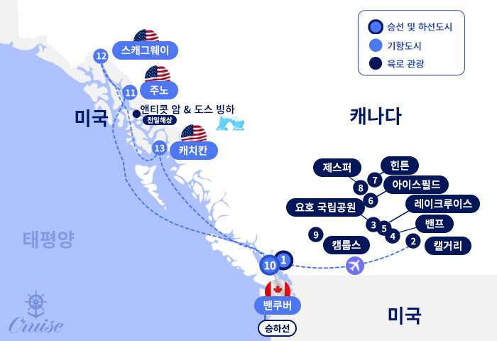 인천 - 밴쿠버 - 캘거리 ▷ 요호국립공원 ▷ 밴프 ▷ 아이스필드/레이크루이스/힌튼 ▷ 재스퍼/캠룹스 ▷ 밴쿠버 승선 ▶ 주노 ▶ 스캐그웨이 ▶ 앤티콧암/도스빙하 ▶ 캐치칸 ▶ 밴쿠버 하선 - 인천
