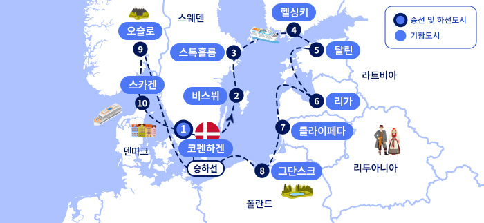 [도시 안내] ▶ 덴마크의 수도이자 아름다운 늬하운 항구가 있는코펜하겐 기항▶ 덴마크의 어업 중심지인 스카겐 기항▶ 스웨덴의 수도이자 스칸다비아반도 최대 도시 스톡홀름기항 ▶ 에스토니아의 수도이자 핀란드 만의 남부 해안에 위치해 있는 탈린 기항▶ 다양한 인종들이 어울려 살아가는 핀란드의 국제적인 대도시 헬싱키 기항▶ 스웨덴 고틀란드섬 해안에 있는 휴양도시 비스뷔 기항